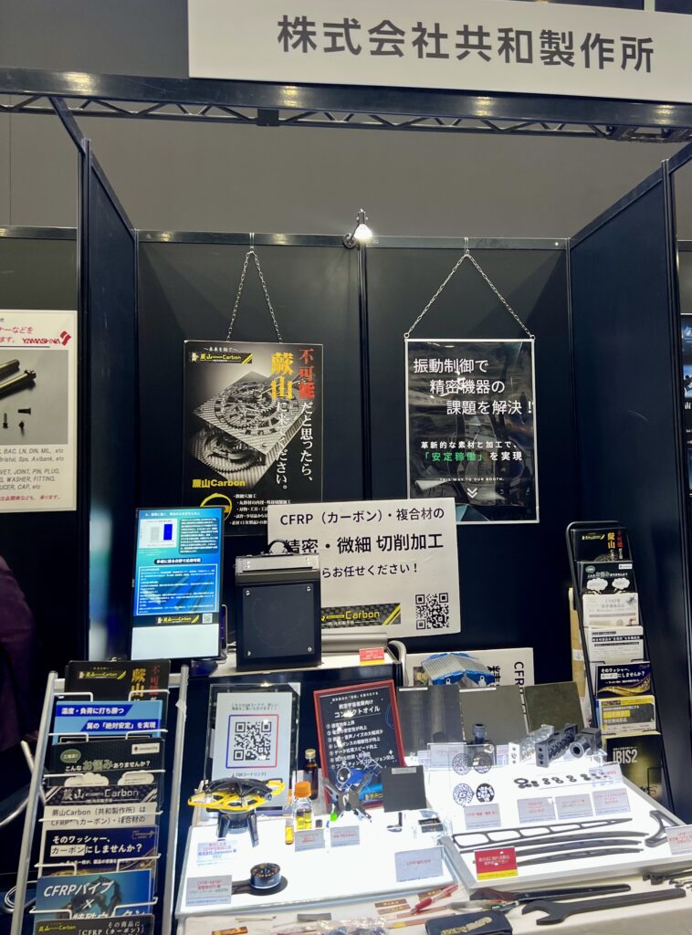 CFRP(炭素繊維強化プラスチック)の機械部品、航空機用のリブ、ドローン部品、ワッシャー等を展示しております。